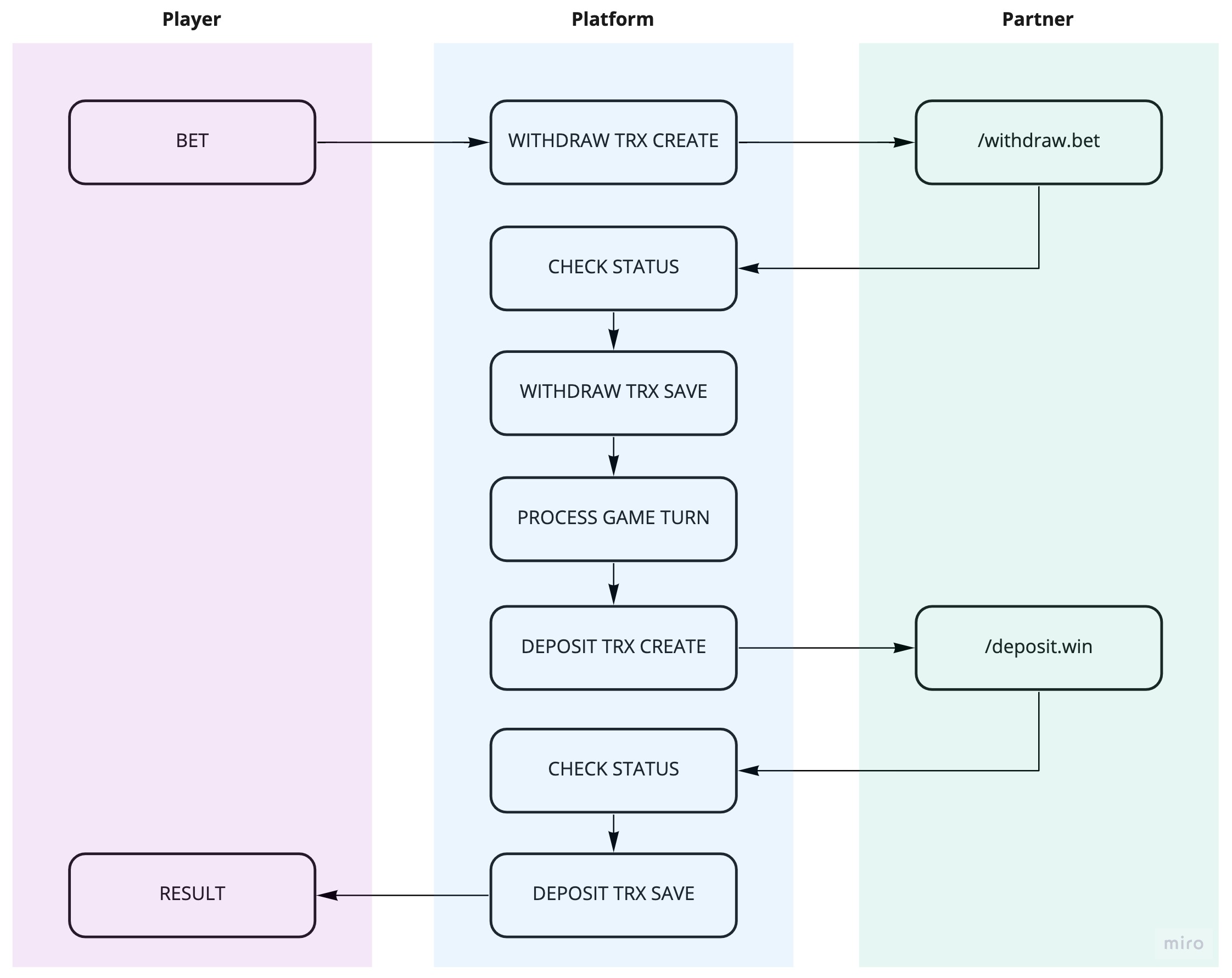 Платформой. На каждый ходИгрокаПлатформаформирует кПартнеру2 запроса/withdraw.bet- списание с баланса игрока стоимости хода. Совершается до начала визуализации результата хода/deposit.win- начисление на баланс выигрыша за ход. Запрос шлется даже если выигрыш нулевой. Присылается при окончательном расчете размера выиграша за игровое действие.