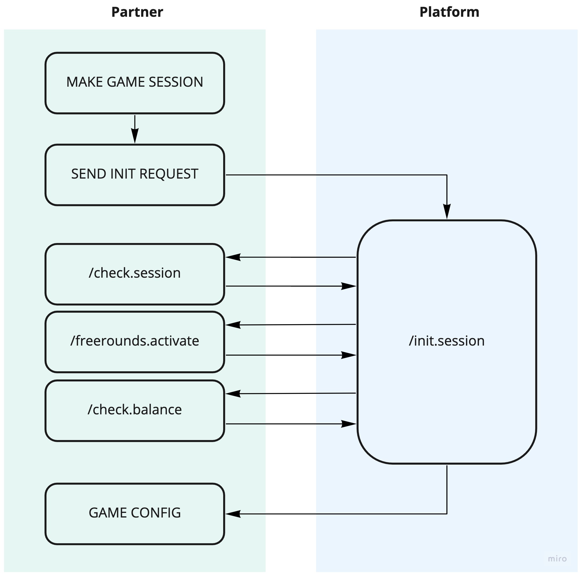ПлатформаотправляетПартнеру3 запроса:/check.session,/freerounds.activateи/check.balanceдля проверки, что запрос инициализированПартнером, а также для получения параметров сессии. - Если проверка запроса прошла успешно, то